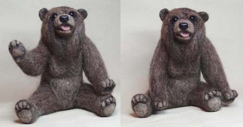 Kovar was modelled on a bear I saw in Yellowstone National Park he was hand sculpted from various wools over a wire armature by repeatedly adding, shaping and working raw wool with various felting needles until it forms the desired core shape.