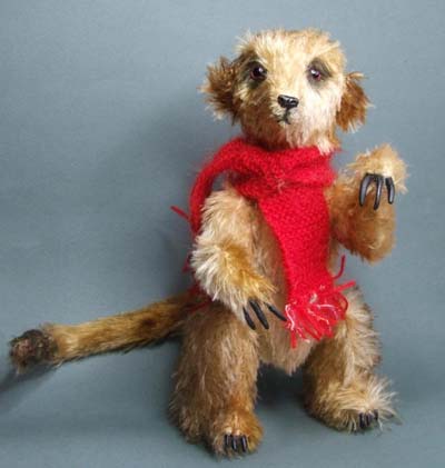 Lucca was made from two mohair fabrics, the one on his tummy and inner parts is a sandy colour while the one used for the outer body is a slightly longer two tone tipped fabric. His nose and claws were handmade using Sculpey, the feet have ultrasuede pads and the eyes are hand painted glass. |