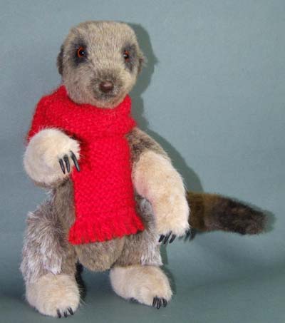 Sasha was made using a variety of high quality woven synthetics. His nose and claws were handmade using Sculpey, the feet have ultrasuede pads and the eyes are hand painted glass. |