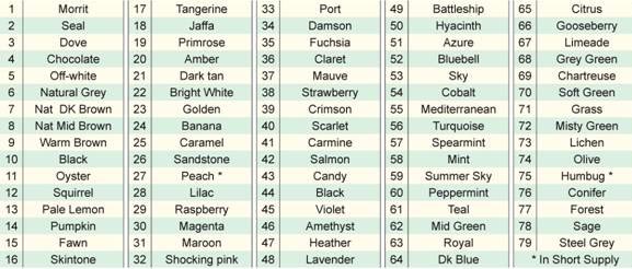 | Colours shown are subject to fashion fluctuations and all weights are approximate | |||||||||||||||||||||||||