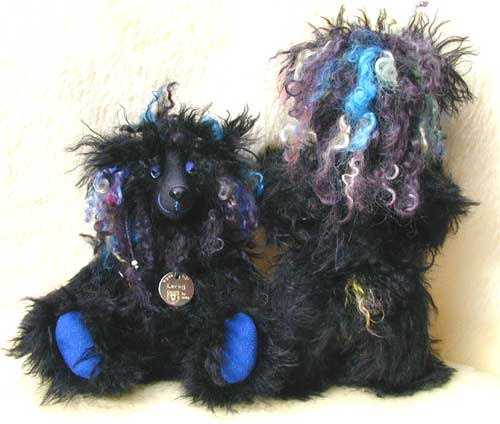 coloured mohair, a with blue suede eyelids and paw pads, wicked hand painted Bright blue glass eyes, black embroidery thread for his smile,