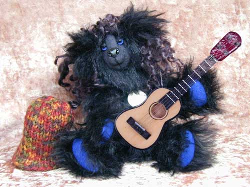 coloured mohair, a with blue suede eyelids and paw pads, wicked hand painted blue glass eyes, black embroidery thread for his smile,
